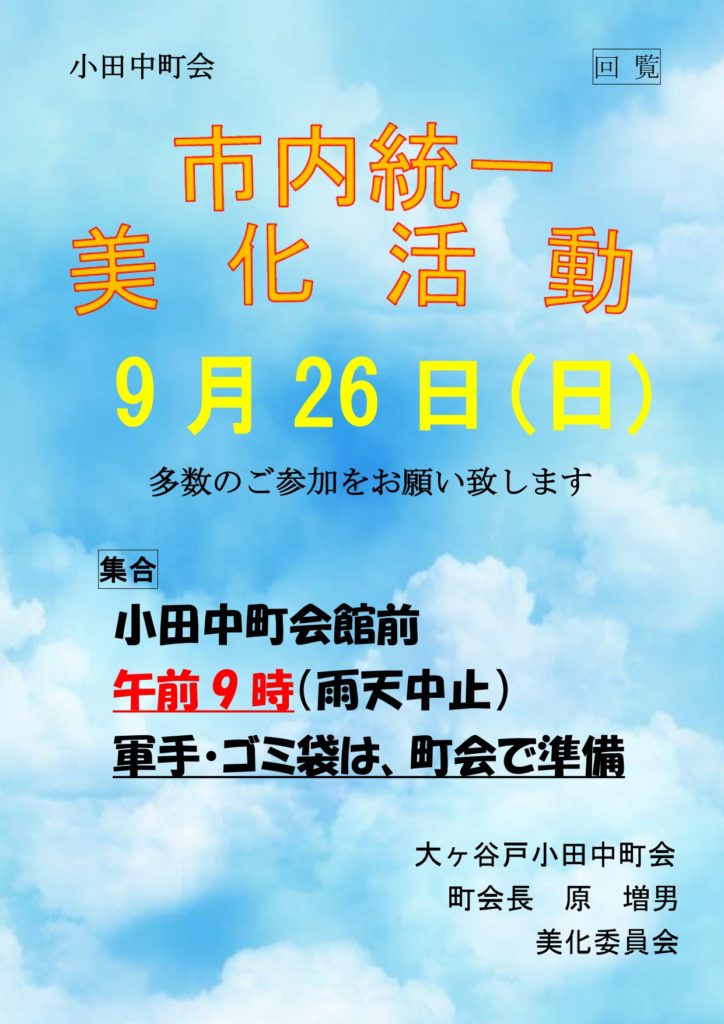 市内統一美化活動を実施します 2021.09.129月26日(日)9時より市内統一美化活動を実施します。参加される方は9時に小田中町会会館にお集まりください。※緊急事態宣言の延長に伴い、川崎市として「中止」を判断する場合があります。